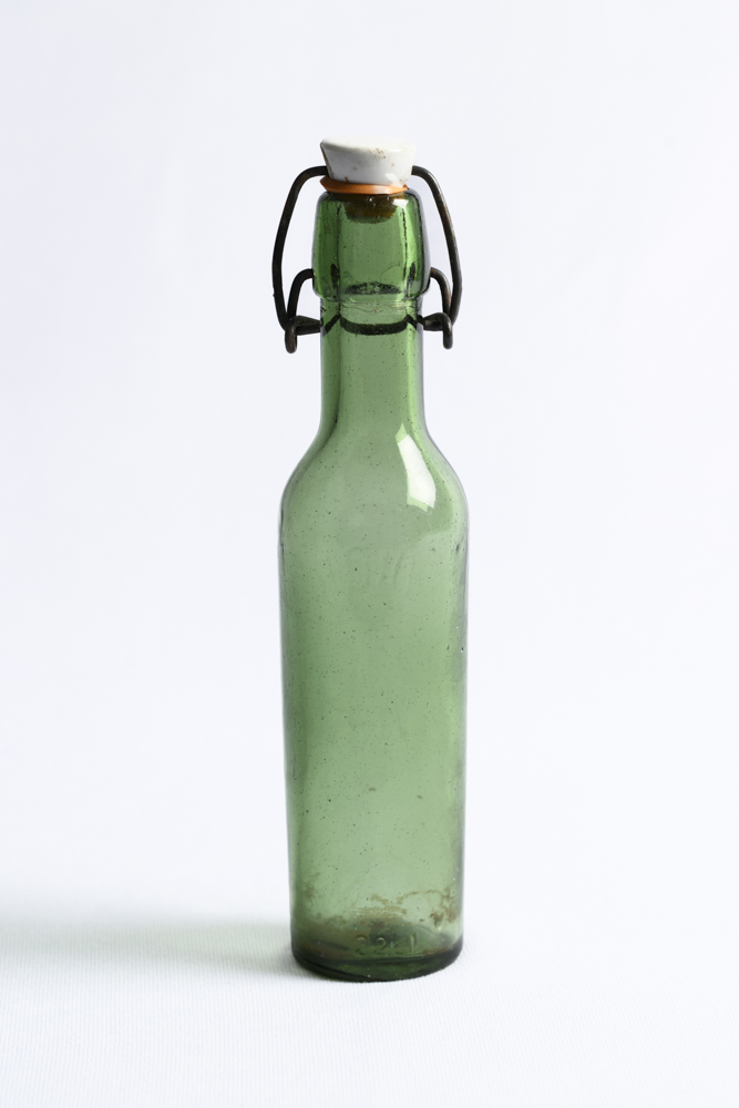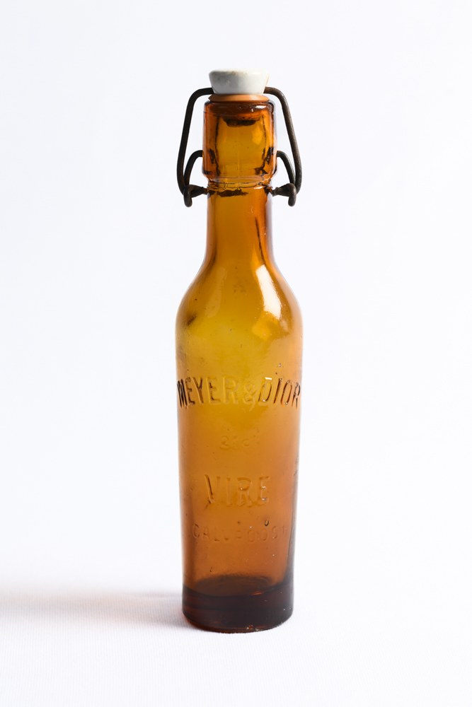 Ces deux bouteilles en verre, qui portent les inscriptions « Meyer & Dior Vire Calvados » et « Dior Vire Calvados », étaient utilisées par la brasserie viroise dirigée par Paul Meyer et son associé Gaston Dior, lointain cousin de Christian Dior. Florissante pendant l’entre-deux guerres, l’usine produisant de la bière, du cidre et du Calvados a été mise à l’arrêt par l’occupant allemand, avant de se transformer en entrepôt jusqu’en 1981.